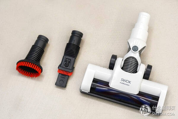 附带了电动地刷、二合一吸尘毛刷头与大口毛刷头。
